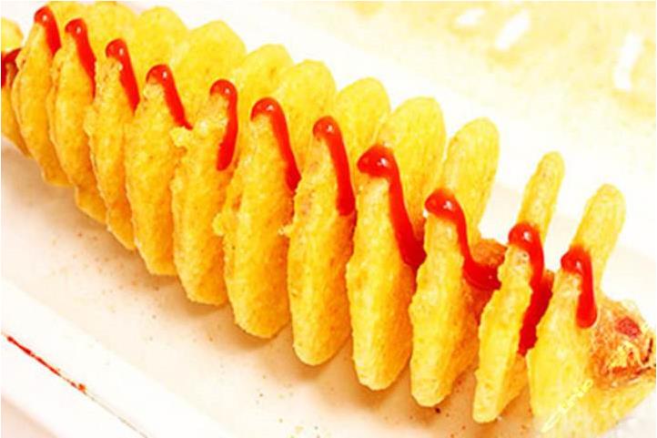 旋转薯塔是将新鲜马铃薯现削现炸,