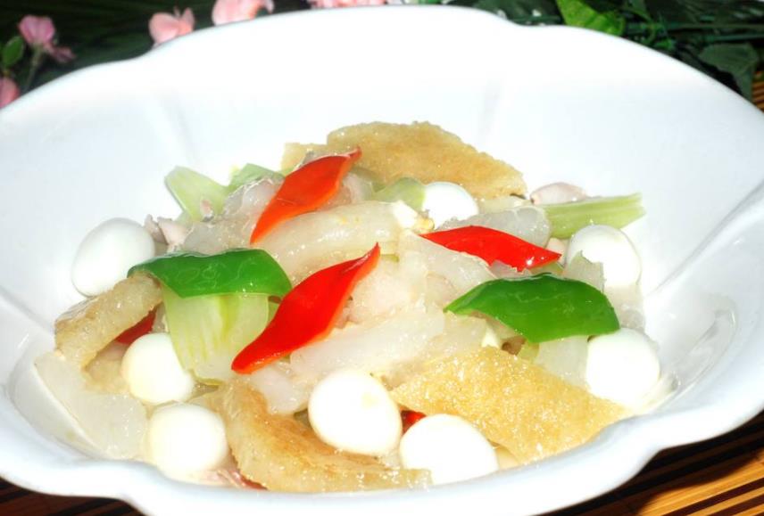 烧三鲜:鹌鹑蛋,虾仁,海参